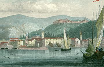 Veduta Rijeke, kraj 1850.-ih Prema Albertu Riegeru i izdanju Oestr Loyd u Trstu Druck u. Verlag v. A.H. Payne, Leipzig u. Dresden Obojena grafika Vel. 200 x 272 mm Rijeka, MGR, inv. br. D-221