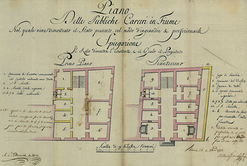 Nacrt zatvora, 1794. Plan Piano Delle Publiche Carceri in Fiume Anton Gnamb i A. L. Adami} Tuš i akvarel na papiru Vel. 371 x 529 mm Spis (12 str.) Vel. 366 x 223 mm Rijeka, DAR 022, spis 617/794, 1 nacrt i tri spisa