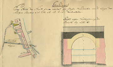 Plan dijela grada kod Lazareta, s nacrtom detalja – presjekom “mosta” (nadsvođenja), 1829.