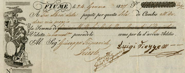 Mjenica, 1827. Fiume, 24 Genaio 1827. Izdana Giuseppeu Tripcovichu u Trstu Papir, tisak, rukopis Vel. 93 x 245 mm Rijeka, MGR, inv. br. 1162.