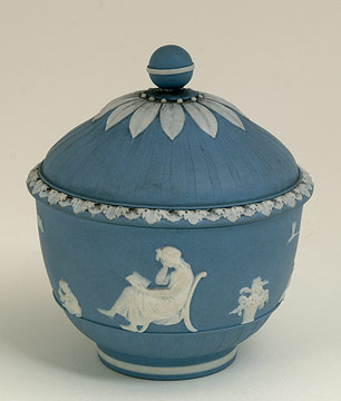 Šećernica, oko 1790. Engleska, Tvornica Wedgwood, Modri i bijeli jasper (kamenjača), reljef Vis. 105 mm, promjer 95 mm Zagreb, MUO, inv. br. 1476