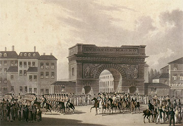Ulazak savezničkih vladara u Pariz, 31. 3. 1814. Nepoznati autor, izdao R. Bowyer, London, 1816. Obojeni bakrorez, točkanje, 300 x 400 mm, ploča, papir rezan Podatak sr. d. "Published by R. Bowyjer, Pall Mall, 1816" Zagreb, HPM/PMH, inv. br. 24546