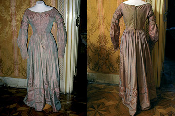 Abito femminile, 1825-1850 taffetas di seta rosa cangiante con profili in verde, Istria (Trieste, CMSA, inv. 10285)