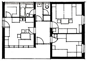 još jedne sobe) i osvaja prvu nagradu. Natječaj je zahtijevao što racionalnija rješenja traženih stambenih zgrada, s jednostavnim rasporedom prostorija i jeftinim konstrukcijama. Čičin-Šainov projekt zadovoljava sve zadane uvjete te donosi maksimalnu fleksibilnost tlocrta; prostorije se mogu povećavati bez promjena u osnovnoj dispoziciji tlocrta.